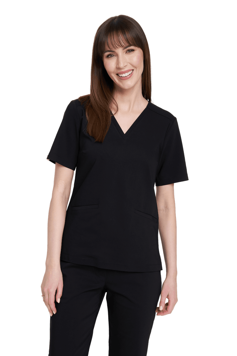 Classic scrubs that win the hearts of our female customers, now available in a premium version! Long-term work requires medical clothes that provide the greatest comfort. Women's scrubs premium medical blouse in black is made of 80% high-quality cotton with a delicate blend of lycra and nylon. Such a combination of fibers in the fabric makes the medical black sweatshirt durable, soft, fits perfectly, does not restrict movement and, what is extremely important, is breathable. Black women's medical scrubs premium blouse is an excellent base for creating a comfortable and versatile closet of medical uniforms. Two capacious and practical pockets on the front of the black medical sweatshirt allow you to keep all the necessary small items at hand during work. The traditional heart neckline of the women's medical black sweatshirt optically elongates the figure, the fitted cut emphasizes all the advantages of a woman's figure, and the length of the sleeves (reaching almost to the elbow) provides protection for the shoulders, while not restricting freedom of movement.Black medical sweatshirt - fashionable and comfortable