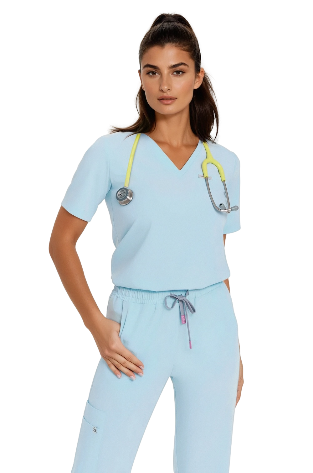 string(101) "Kobieta w błękitnej bluzce medycznej damskiej scrubs Basic One Pocket DREAM z żółtym stetoskopem"