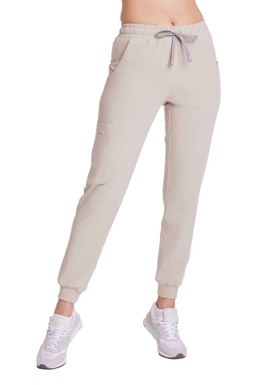 string(97) "Damskie spodnie medyczne joggery w kolorze cold nude z kieszeniami i ściągaczami przy kostkach."
