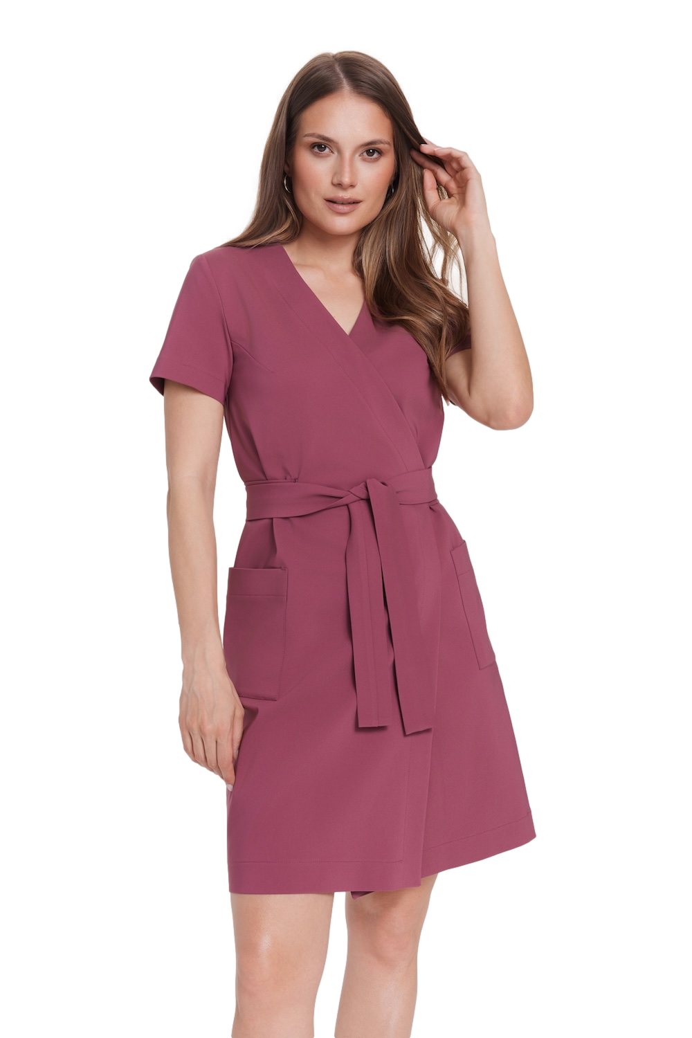string(94) "Modelka w sukience medycznej kopertowej z krótkim rękawem Premium Malwa w kolorze różowym."