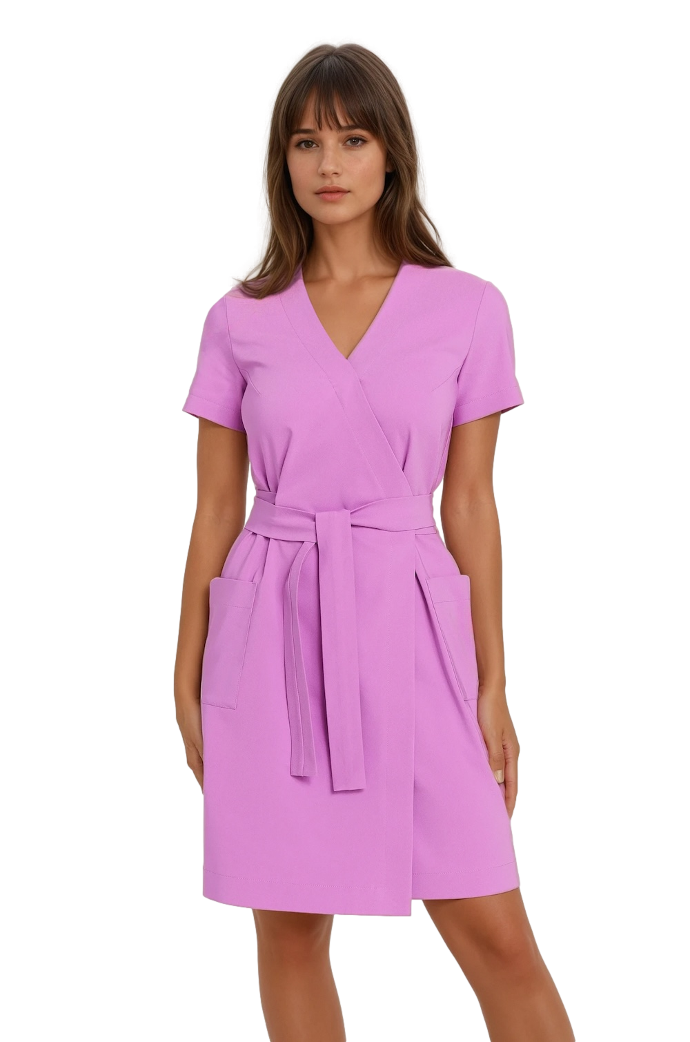 string(109) "Modelka w różowej sukience medycznej kopertowej z krótkim rękawem Premium ROSALIA z paskiem i kieszeniami"