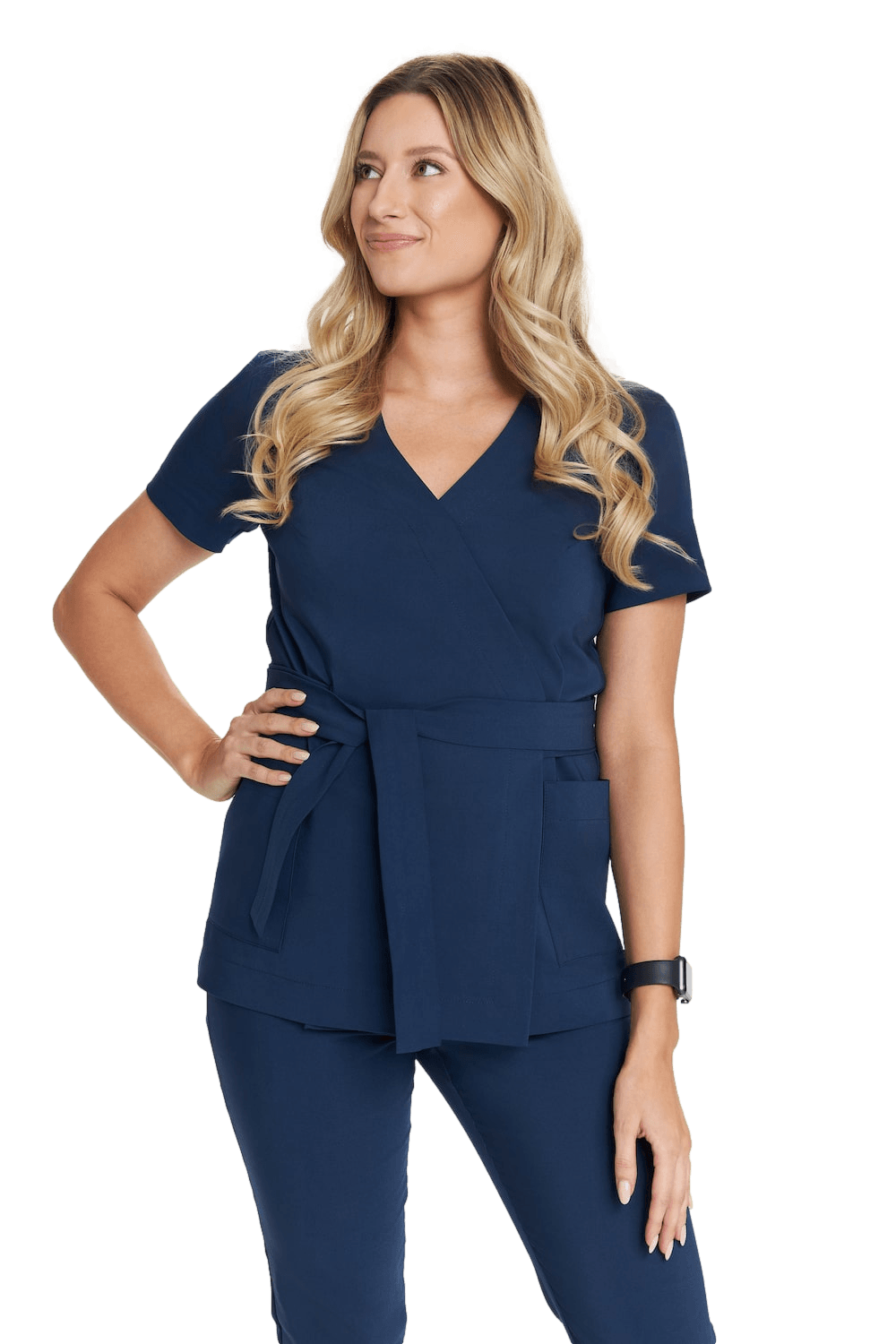 Tunika medyczna kopertowa z krótkim rękawem Premium w kolorze granatowym świetnie wygląda z przylegającymi spodniami medycznymi, które zostały wykonane z tego samego materiału.